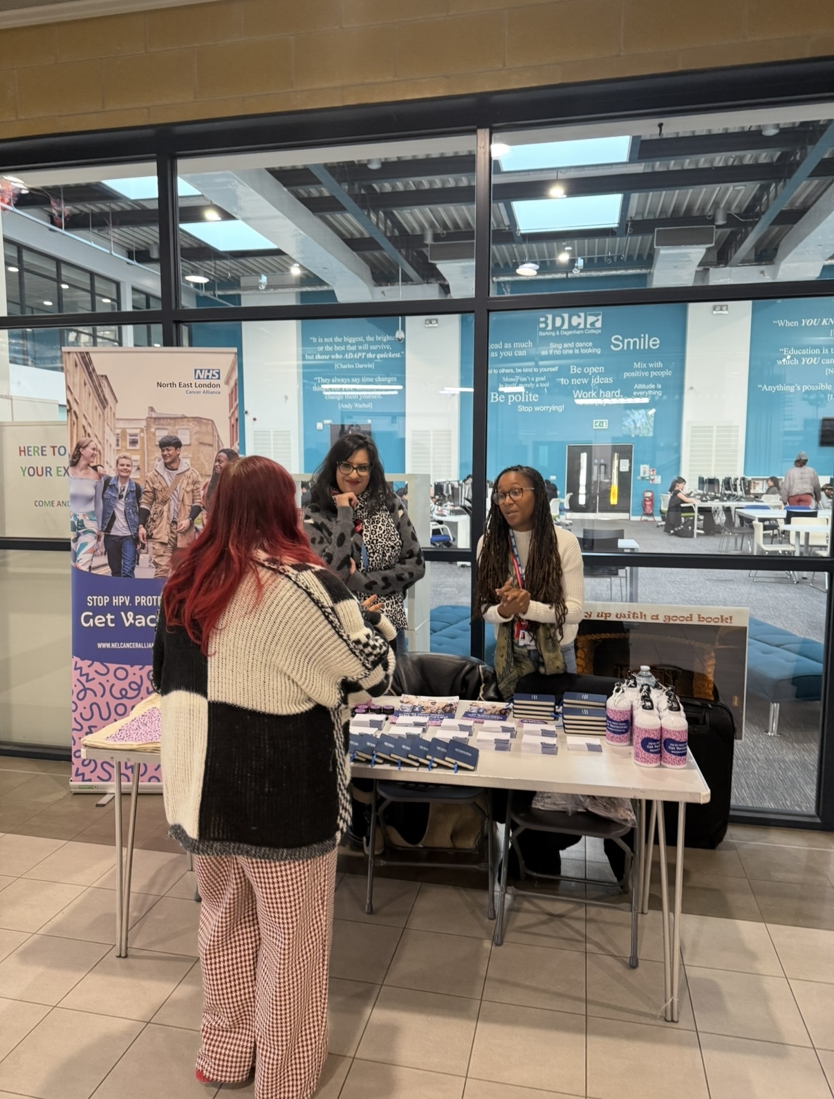 The North East London Cancer Alliance (NELCA) team visited Barking and Dagenham college, setting up an information stall on a regular school day to raise awareness about the HPV Vaccine. The team aimed to educate students on the importance of the vaccine and explain how they can still access it if they missed their dose at school.